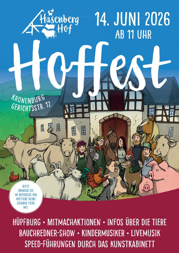 Wir freuen uns sehr, Sie dieses Jahr wieder auf unser Hoffest auf den Hasenberghof einladen zu können. Das Hoffest findet am Sonntag, den 14. Juni 2026 ab 11:00 Uhr statt. Neben Informationen über die Dr. Axe-Stiftung und die auf dem Hasenberghof lebenden Tiere erwartet Sie ein abwechslungsreiches Unterhaltungsprogramm für die ganze Familie (Hüpfburg, Mitmachaktionen, Infos über die Tiere, Bauchredner-Show, Kindermusiker, Livemusik, Speed-Führungen durch das Kunstkabinett). Natürlich gibt es auch ein reichhaltiges Angebot an Speisen und Getränken.